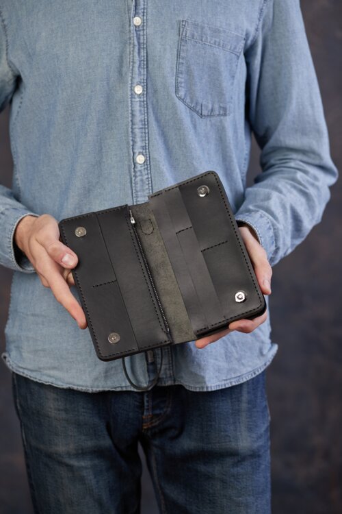 Модель «The Titan» сшита из черной итальянской натуральной кожи КРС. Торцы обработаны химией для долговечности.