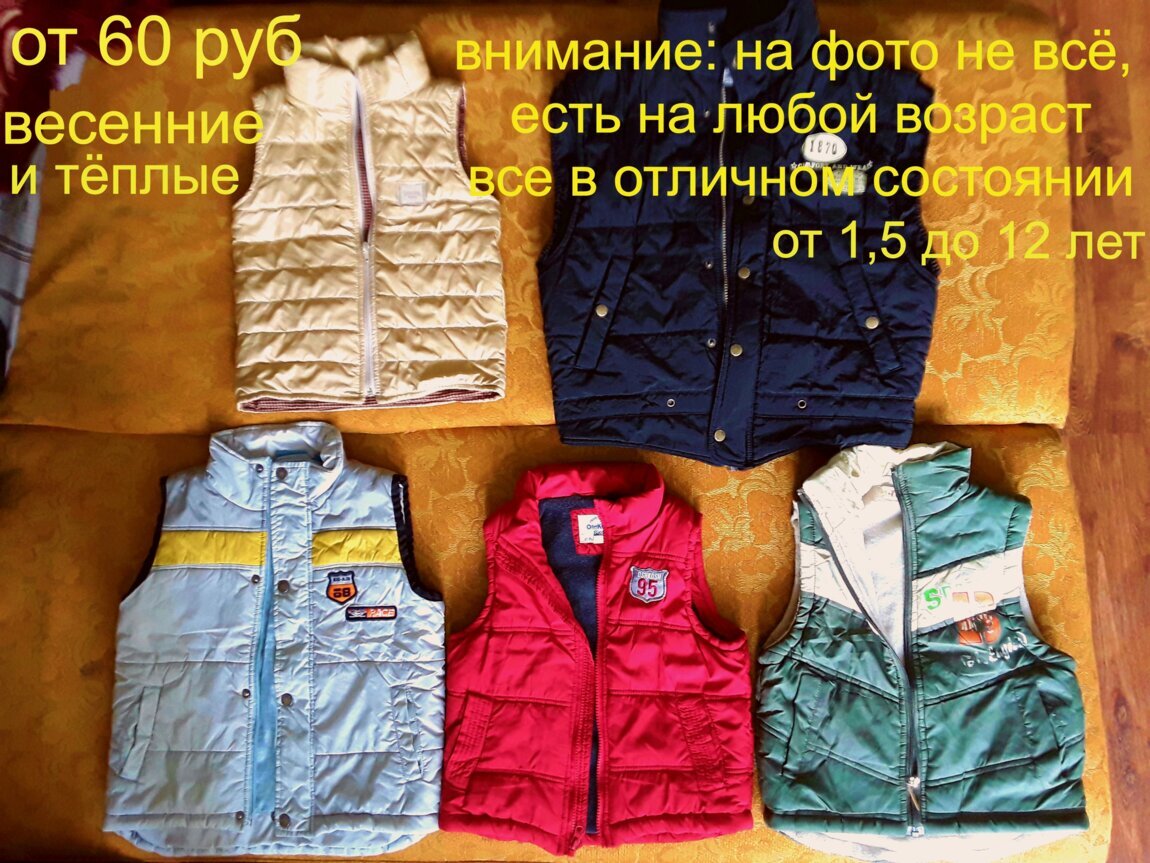 1. Безрукавка, жилетка (куртка без рукавов) на любой возраст - 5 штук. Тёплые и лёгкие. Цены 80-100 р. Состояние у всех идеальное, без повреждений.