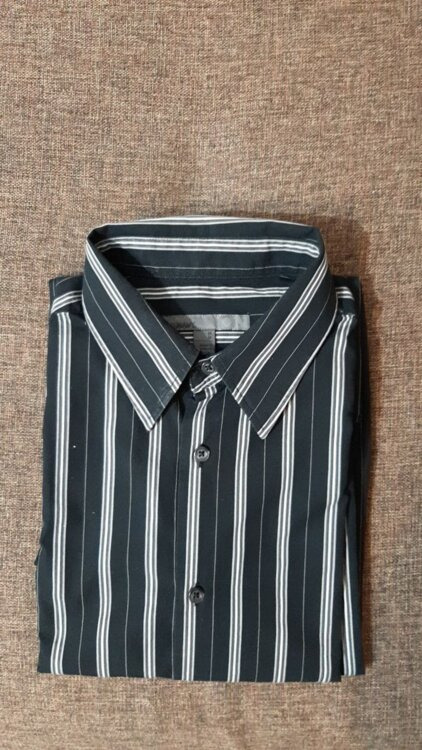 - Рубашка в черно-серо-белую полоску. Размер М (ворот 43). Ширина 53-54 см. Немного б/у. Цена 15 руб.