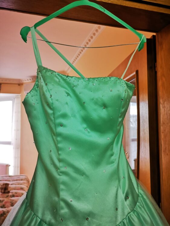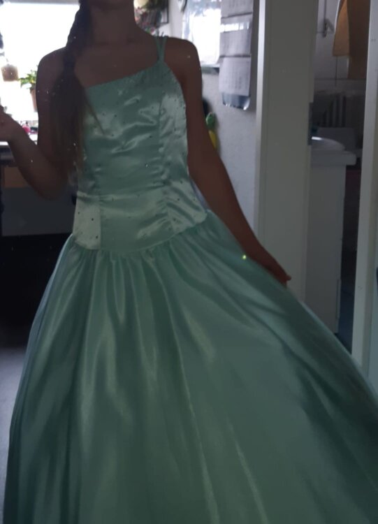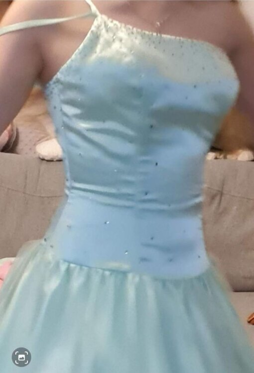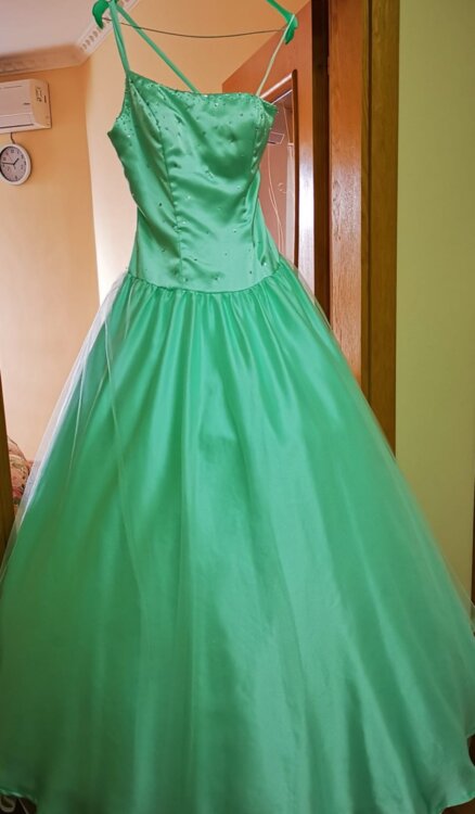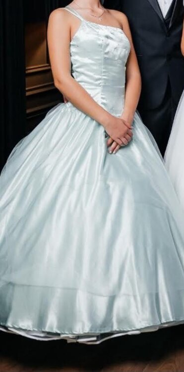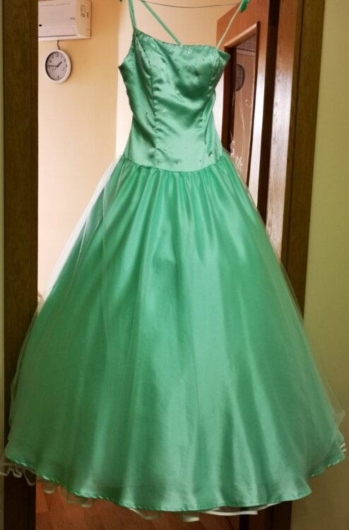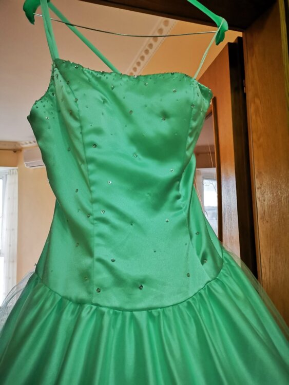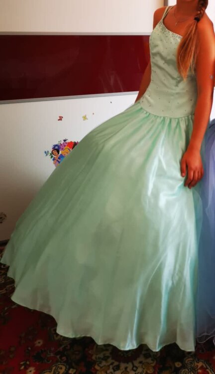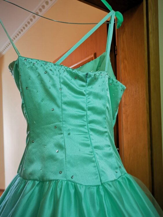 Rochița este confecționată din țesătură delicată de atlas subtire de culoare turcoaz. Partea de jos dispune și de doua poale\rinduri de fatin și cerc de diametru mare, ceia cei dă rochiței o finețe elegantă. Corsetul este îmbogățit cu biser strălucitor ceia sei dă un rafinament elegant.
