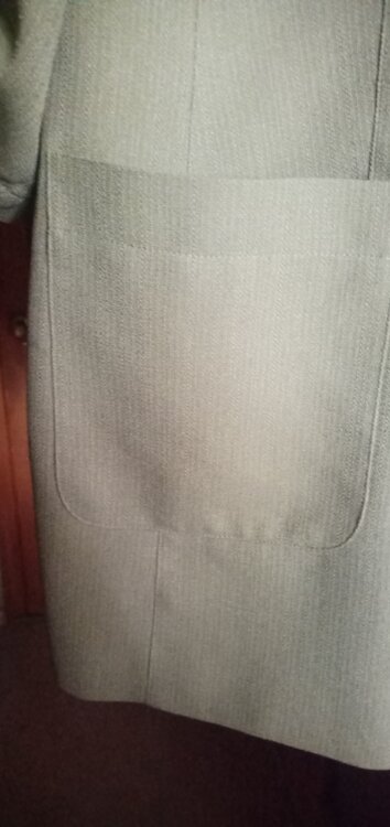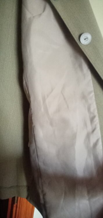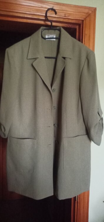Новый жакет 46/48р-р, полочка на подкладе, накладные карманы, рукав 3/4,погоны, цвет хаки, плечики, длина от плеча -75см., ок. г. 102/104см., на спинке низ шлица.