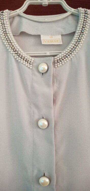 Новые блузы немецкие 36/38р-р, (44/46), цвет: светло- серая -перламутр, горловина бусины жемчуг камни искусственные, плечики, -блуза цвет белая супатная застёжка, плечики, декор мелкая строчка на плечах и планке на застёжке.
