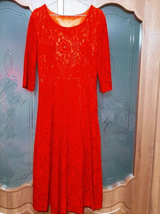 - Платье кружевное красное (на самом деле немного темнее, чем на фото), размер 46-48, миди. Сбоку молния. Длина юбки от талии 80 см. Объем талии 78-80см. Одевалось один раз. Цена 100 руб.