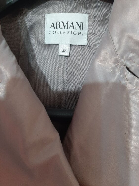 - Плащ Armani collezioni серо-сиреневого цвета. Двубортная застежка. Пояс. Цена 60 руб.