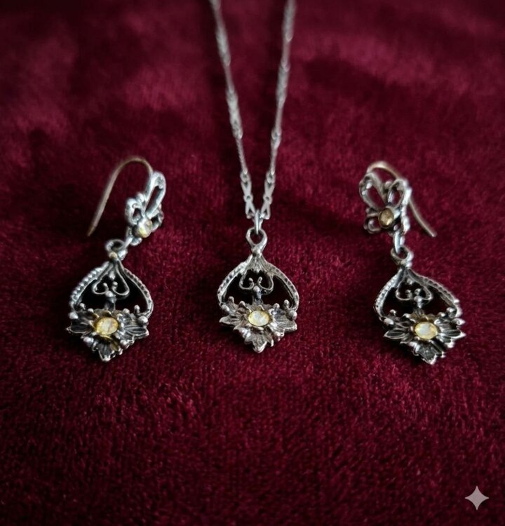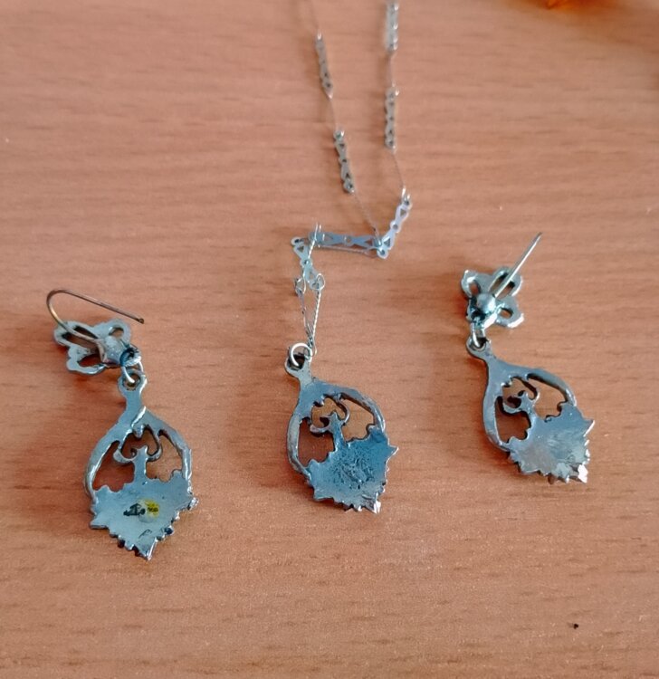 изделия выполнены из мельхиора с глубоким посеребрением и последующим оксидированием («чернением») для создания винтажного эффекта. Вставки, представляют собой синтетический финифть/кварц.