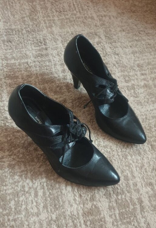 Туфли чёрные, кожаные, лакированные со шнурками 39 размера, каблук- 8,5 см.