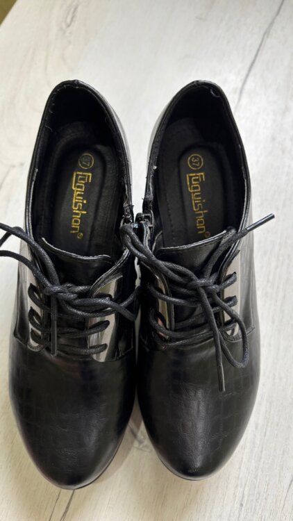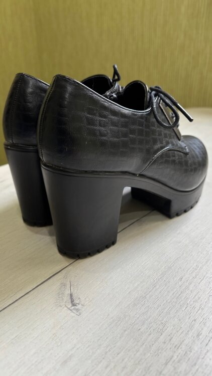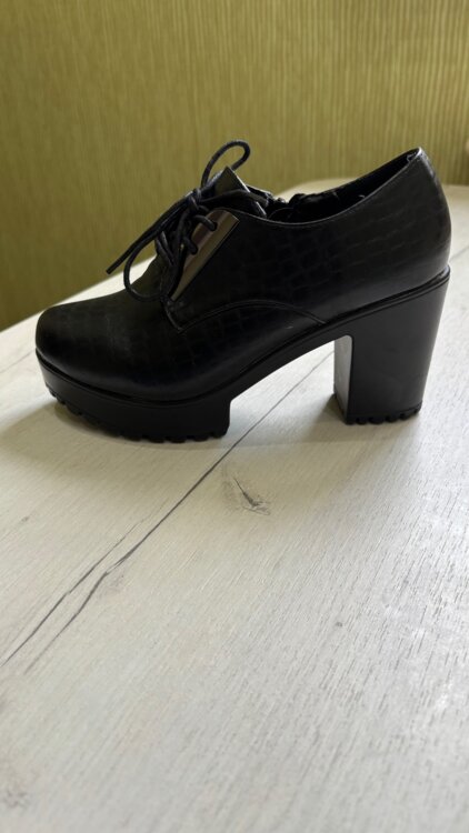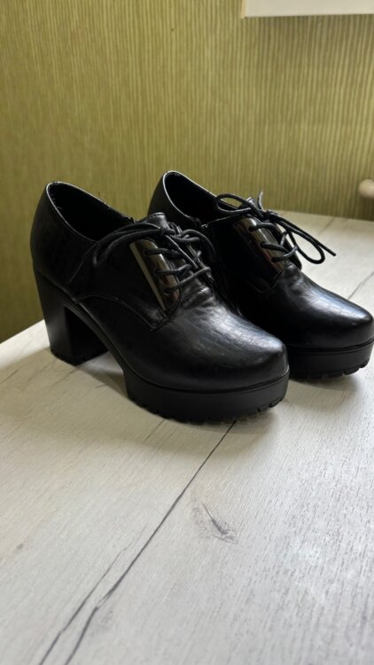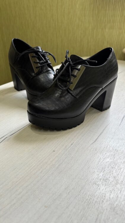 Продаются чёрные ботинки на устойчивом каблуке. Впереди шнуровка. Царапин нет.