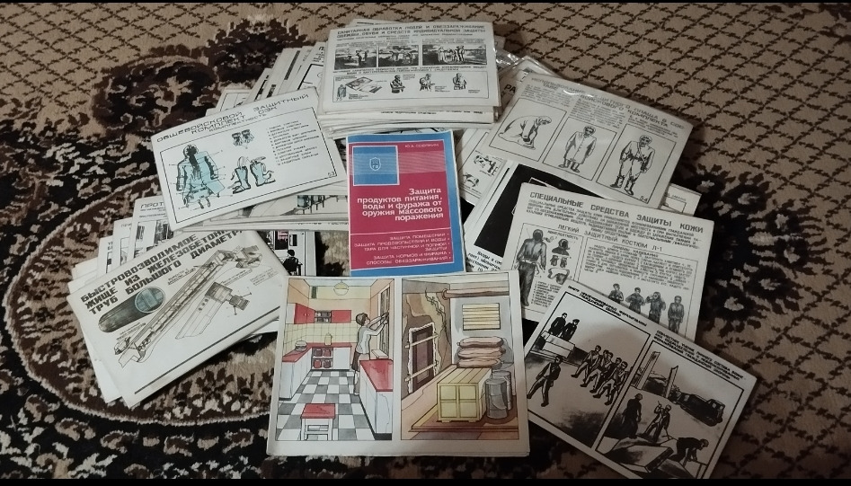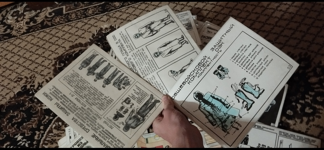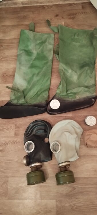 В наличии чулки с плащом ОЗК 2 размера, противогазы ГП5 и ПМГ2 разных размеров, также есть фильтры ГП5, мембраны для переговорного устройства (противогазов типа ШМС, ПМГ2), КЗД4, гидро чехлы на фильтры черного цвета, запасные заклёпки и клипсы ОЗК, маленькие таблички-плакаты с разным содержанием, книга го.