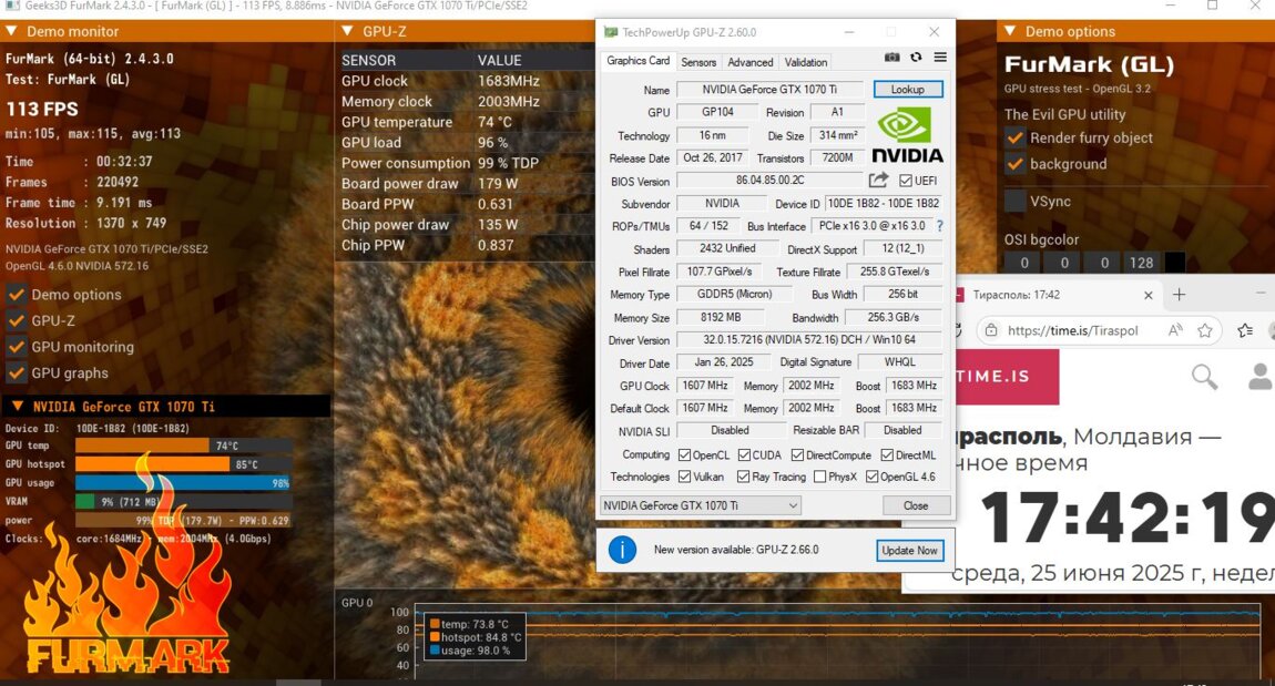 Видеокарта Palit GeForce GTX 1070 Ti DUAL [NE5107T015P2-1043D] предназначена для монтажа в системы, рассчитанные на высокий уровень производительности в насыщенных графикой играх. Рекомендуется блок питания с мощностью не ниже 500 Вт. Максимальное энергопотребление видеоадаптера – 180 Вт. Требуется организация дополнительного питания с использованием разъема 8-pin. Также необходимы 2 свободных слота расширения. Длина видеокарты сравнительно невелика: она равна 252 мм. Гарантия от продавца: 3 месяца. Тесты в видео.