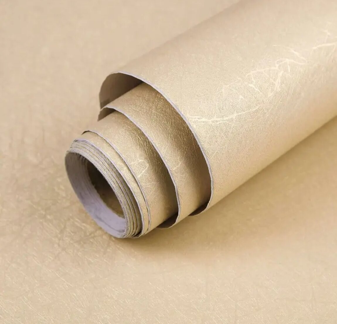 Обои самоклеящиеся цвета шампань, моющиеся. Размер 1 рулона 10 м * 0.45 м. В наличии 7 рулонов. Цена 70 лей/рулон.