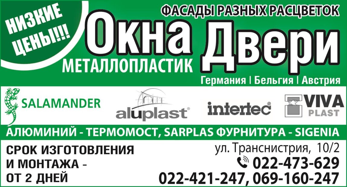 ОКНА, ДВЕРИ. Низкие цены. Металлопластик, алюминий. "SALAMANDER'', ''VIVA'', ''ALUPLAST'', ''INTERTEC''.