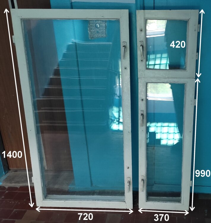 Продам два крашенных деревянных окна б/у. Одно большое окно в зал с двумя формугами и одной форточкой. И одно малое окно с одной формугой и форточкой. Все окна со стеклом. Рама двойная. Размеры окон смотри на фото. Цена указана за оба окна. Торг уместен.