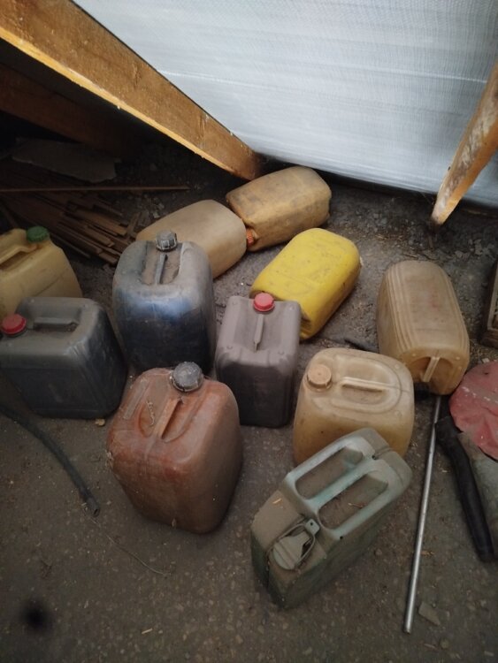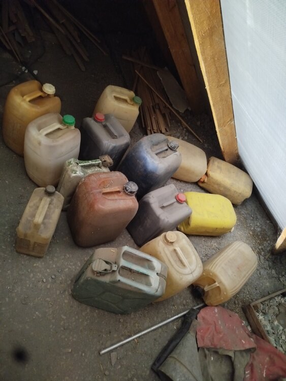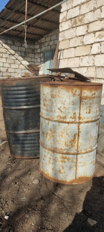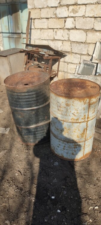 Канистры много разные. Бочки железные.