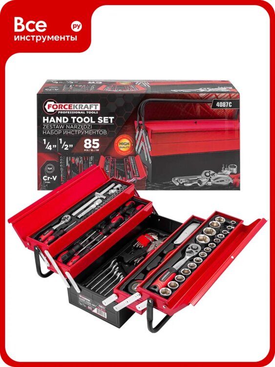 Набор инструментов в переносном ящике для инструментов, 5 лотков, 85 предметов используется для работ с крепежом при проведении различных монтажных и ремонтных работ.