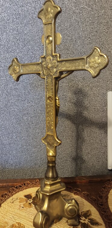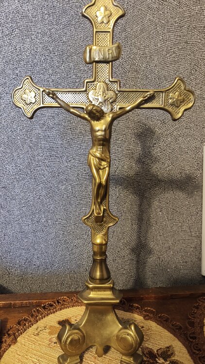 Крест представляет собой большое старинное латунное распятие размером около 13,5 дюймов (33 см) в традиционном дизайне, обычно используемом в христианских католических церквях. Изготовленное из латуни, это алтарное распятие, имеет религиозное и историческое значение для коллекционеров, интересующихся христианскими артефактами и религиозным декором. Детальное изображение Иисуса на кресте является важным символом веры и преданности.