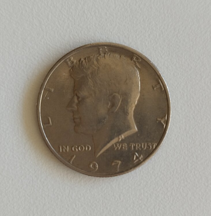 Изображён портрет Джона Кеннеди, 35-го президента США, вправо. Надписи: LIBERTY / IN GOD WE TRUST / 1974.