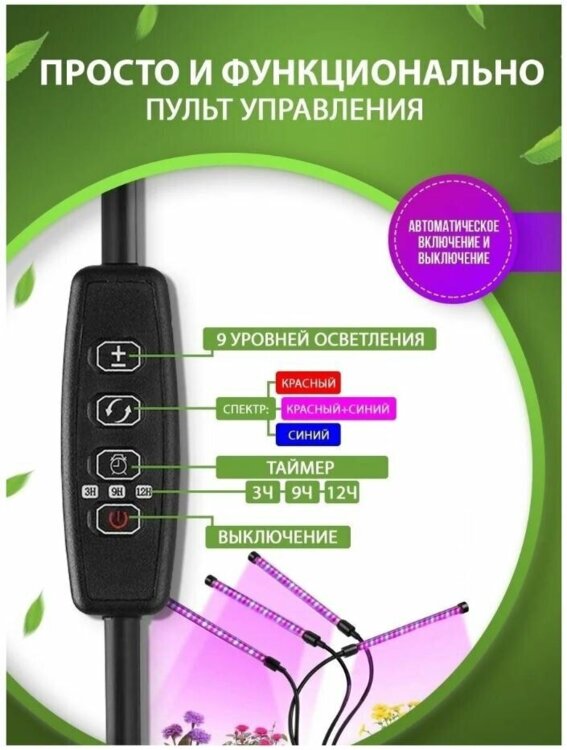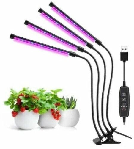 Фитолампа на 4 светильника – осветительный прибор, предназначенный, для подсветки растений, рассады. Позволяет создать оптимальные условия для роста в любое время года. Как известно, в зимний, осенний период естественного света растениям не хватает. И чтобы восполнить этот дефицит, стоит использовать фитолампу. Представленная модель работает от порта USB. Она оснащена 4 световыми панелями, которые легко поворачиваются за счет гибкости основания на 360 градусов. Такая особенность позволяет направить лампы в разные стороны, а также под разным углом. Источник светового потока – светодиоды. Потребление электроэнергии минимальное. Есть таймер, который позволяет устанавливать время постоянного освещения. Лампа крепится с помощью прищепки. Особенности: Двойной таймер, вам нужно установить таймер только один раз. 3 режима таймера-4 часа, 8 часов и 12 часов. 5 режимов яркости с регулируемой яркостью 3 варианта выбора количества освещения и переключателя Красного/синего света. Изготовлен из алюминия и ПВХ, легкий и прочный с хорошей теплоотдачей. Синие светодиоды влияют на образование хлорофилла, позволяя растению потреблять больше энергии. Растения, получающие больше синего света растут с прочными, здоровыми стеблями и листьями. Красные светодиоды способствует оптимальному развитию. Это важно для ранней жизни растения, для прорастания семян, роста корней Характеристики: Тип товара: светодиодный светильник для выращивания растений