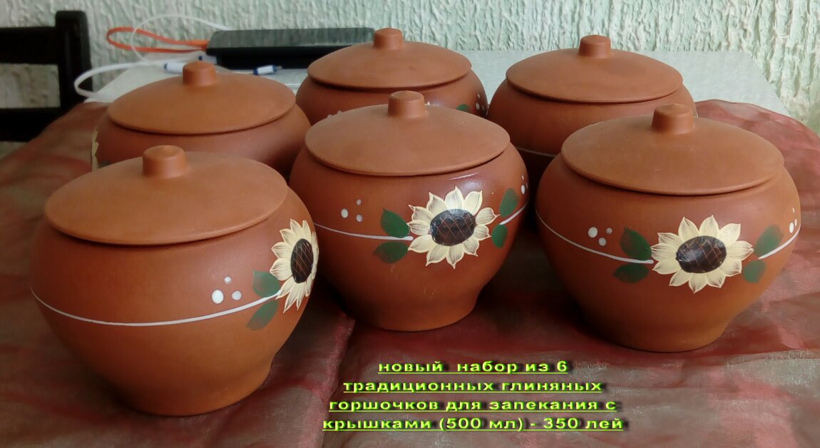1.Новый набор из 6 традиционных глиняных горшочков для запекания с крышками (500 мл) - 350 лей;