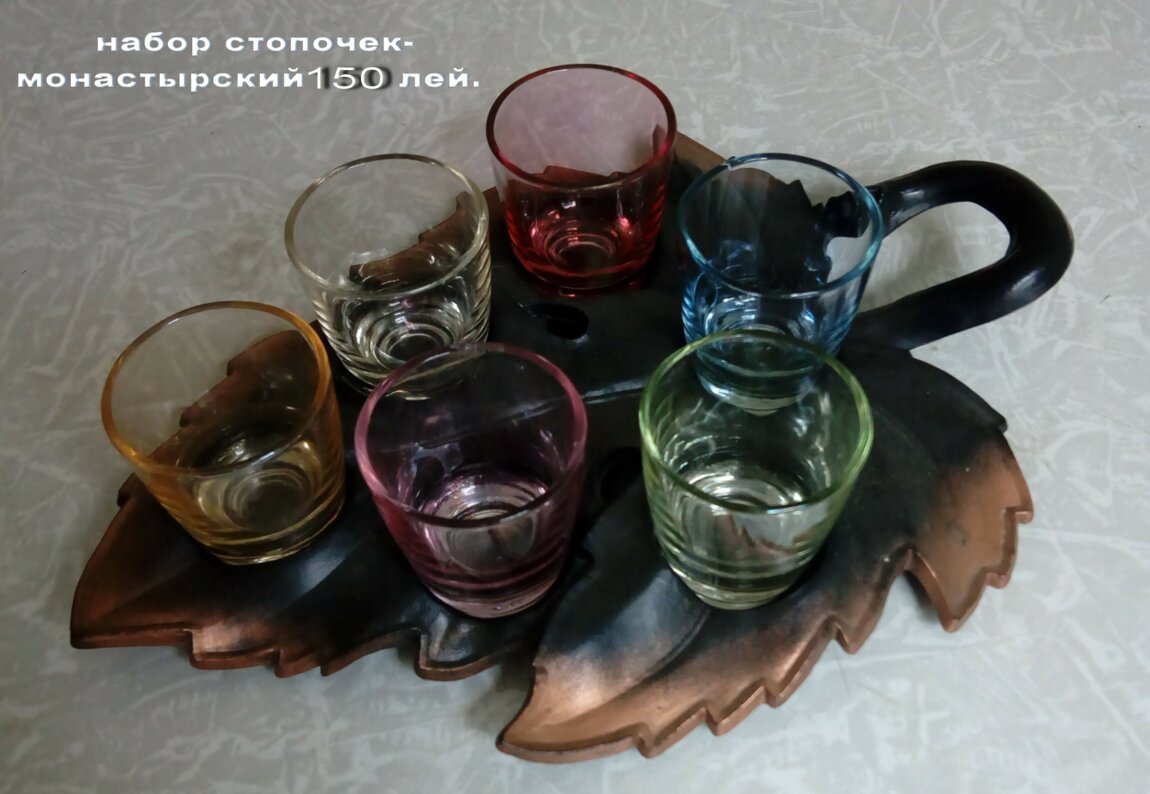 6. монастырский набор из красочных стопочек. Карпаты 1970г.. на дне стопочек отражается Св. крест- для освящения напитков.. - цена условная 150 лей.