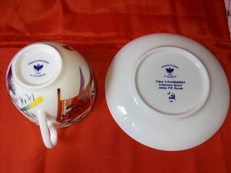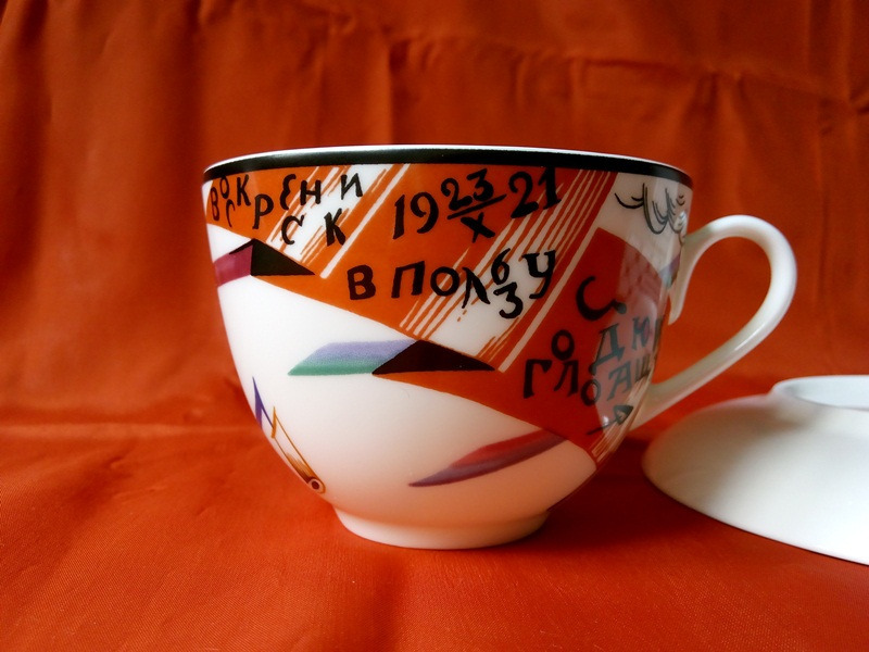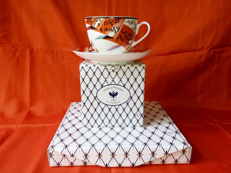 Роспись чашки с блюдцем «Молот и шестерня» на форме «Весенняя», воссозданных по оригиналам лучших образцов агитационного фарфора собрания Государственного Эрмитажа, пронизана темами, образностью, самобытностью, пластическими и живописными ассоциациями своего времени, ностальгией по культуре и духовной атмосфере старой России гениев авангарда.