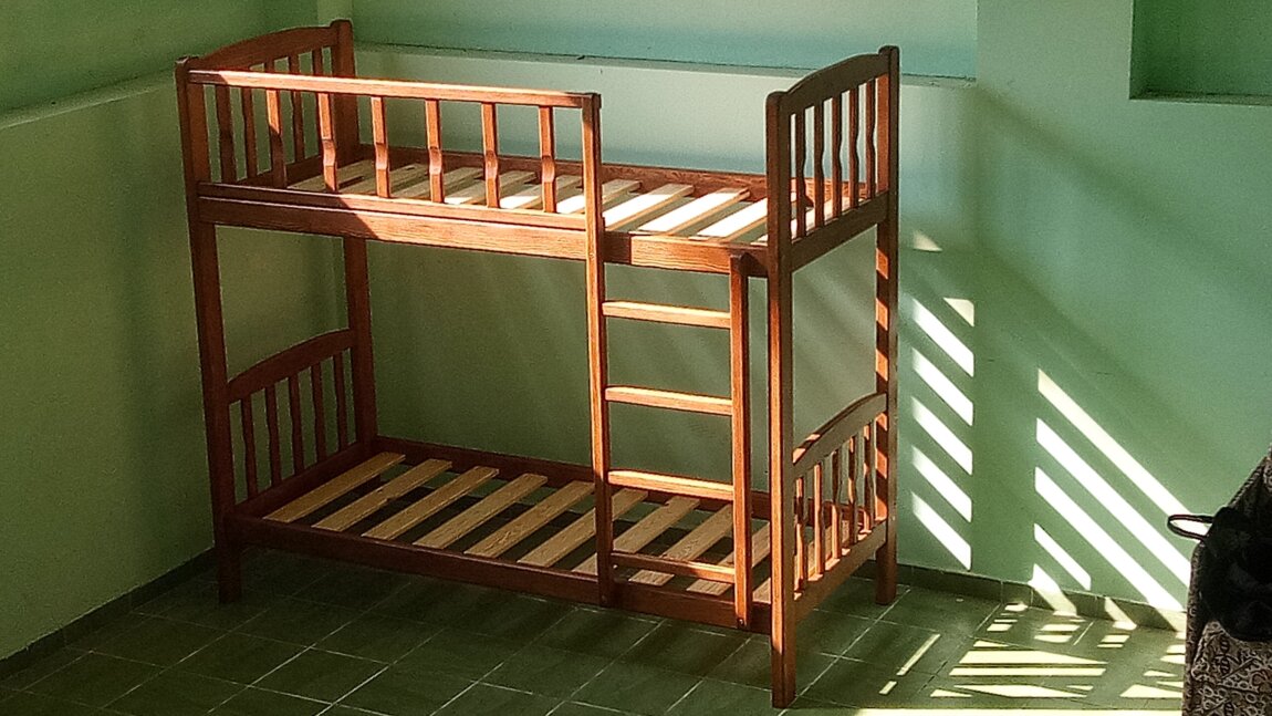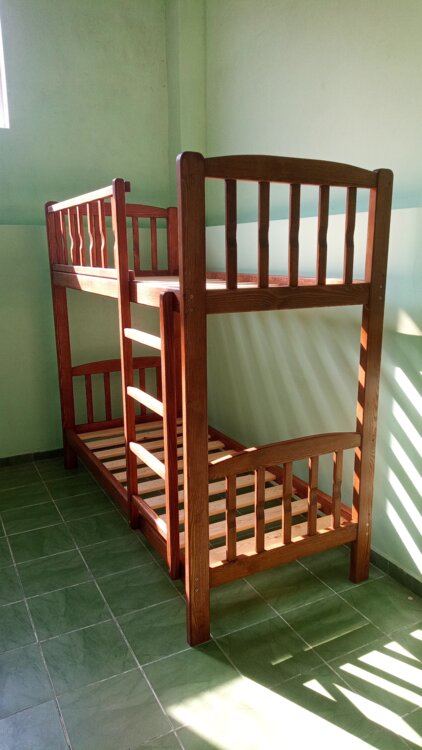 Продается новая 2-ярусная кровать из массива сосны. Кровать рассчитана на матрац 85 х 190 см, высота кровати - 175 см, расстояние между первым и вторым ярусом - 95 см.