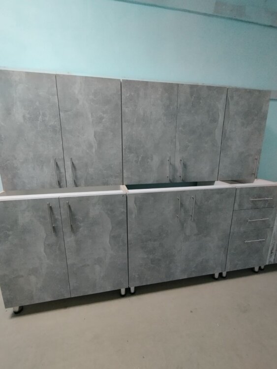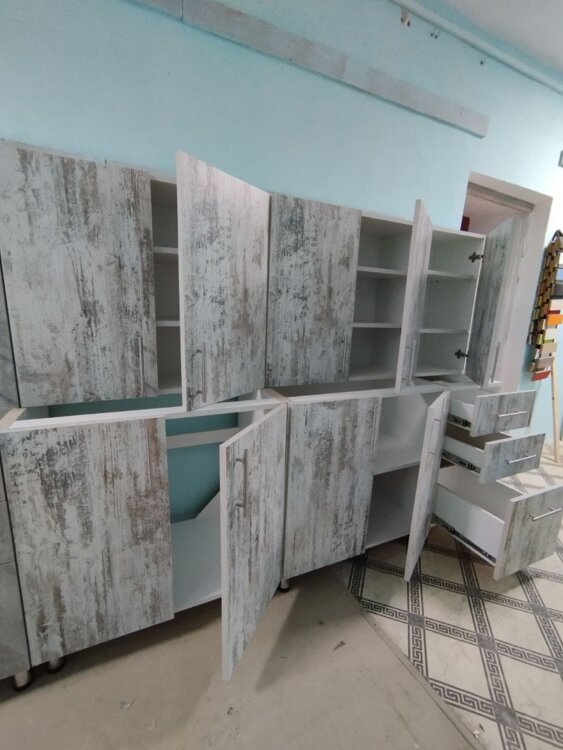 Низ 80см. под мойку, низ 80см. рабочий шкаф, низ 40см. с тремя выдвижными ящиками.