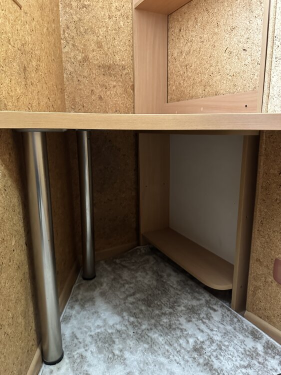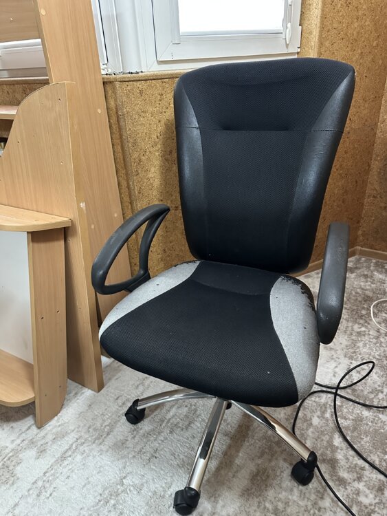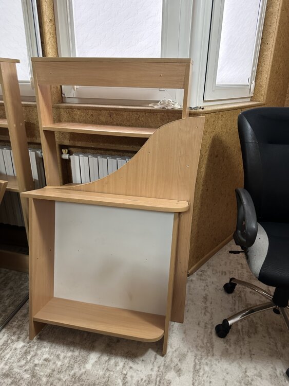 Стол и 2 большие полки, офисное кресло.