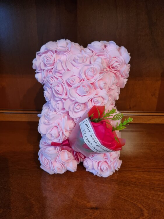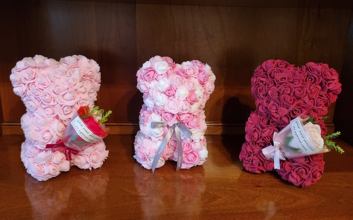 Ursulet format din mici trandafiri din spuma. Este un cadou ideal pentru cei dragi, cu ocazia Zilei Indragostitilor, 8 Martie, si alte sarbatori cu care iti poti surprinde persoanele dragi.