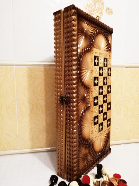 Нарды шахматы ореховые борта ручная резьба вырезанные техникой Геометрия со всех сторон и боков также и внутри нард на бортах есть резьба клетки поля вырезаны в форме звёзд нарды облагорожены чеканкой по дереву размер нард 60 на 60см фигурки и фишки ясень дуб кубики кость. Поиграл и повесил на стенку украсит любой интерьер и создаст уютную обстановку а не будут пылиться в углу. Широкий выбор в наличии выбирайте. Пишите звоните телеграм ватцап вайбер и мы вам поможем выбрать эксклюзивные нарды ручной резьбы а не дешевую поделку вырезанные на станке выдающую за ручную резьбу!