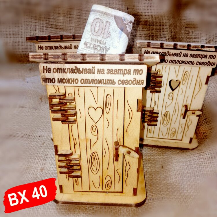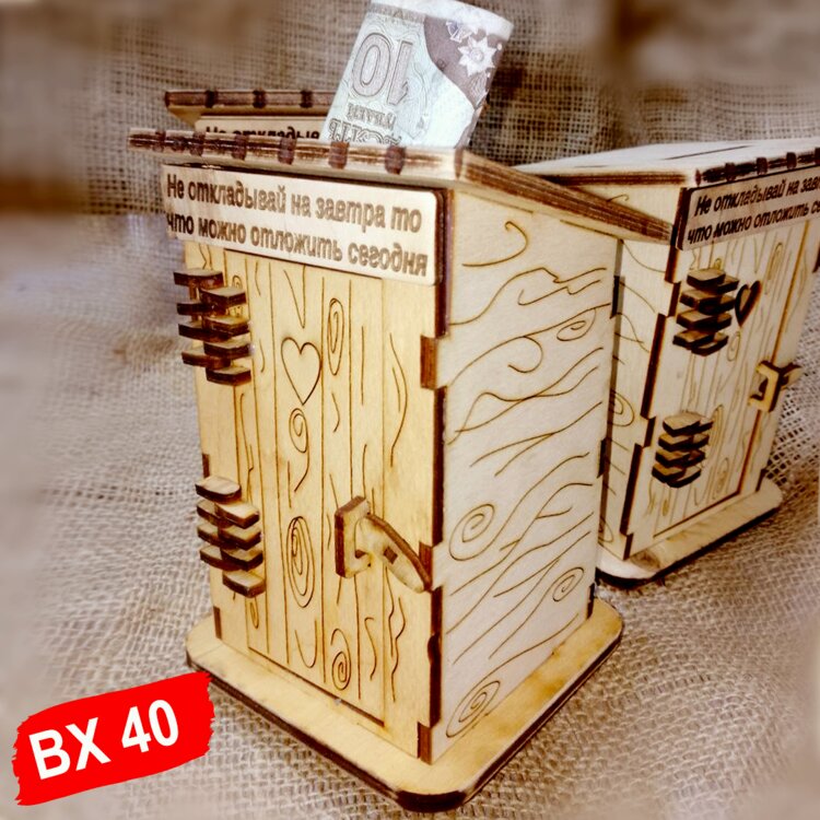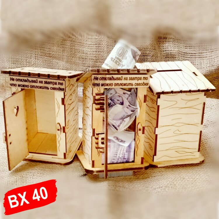 Шутливая копилка для денег в виде деревянного туалета будет оригинальным подарком мужу и жене на свадьбу, детям, родственникам, друзьям и близким на новый год, рождество, день рождения или любой другой праздник. Копилка может послужить небольшим сундучком для казны, поможет упаковать подарок и с юмором вручить его на празднике. В копилку поместится как купюра любого номинала, так и любая монета через специальное отверстие на крыше. Все декоративные элементы подарка выполнены качественно, гравировка нанесена с учётом малейших деталей.