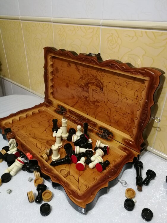 Нарды шахматы ручная резьба вырезанные из Дикой Черешни со всех сторон и боков также и внутри нард на бортах есть резьба клетки поля вырезаны в форме звёзд нарды облагорожены чеканкой по дереву размер нард 60 на 60см фишки ясень дуб кубики кость. Поиграл и повесил на стенку украсит любой интерьер и создаст уютную обстановку а не будут пылиться в углу Широкий выбор в наличии выбираете. Пишите звоните телеграм ватцап ваибер и мы вам поможем выбрать эксклюзивные нарды ручной резьбы а не дешёвую поделку вырезанные на станке выдающую за ручную резьбу!