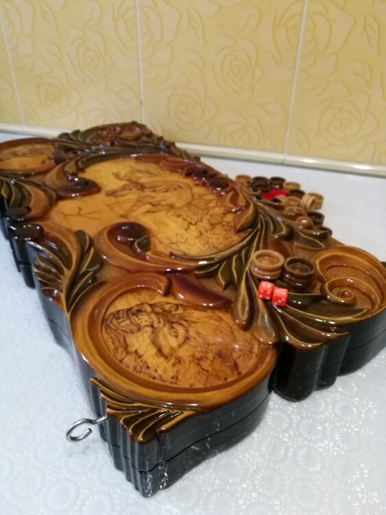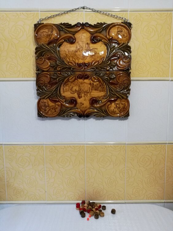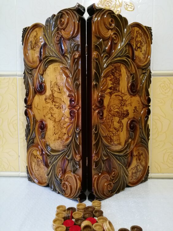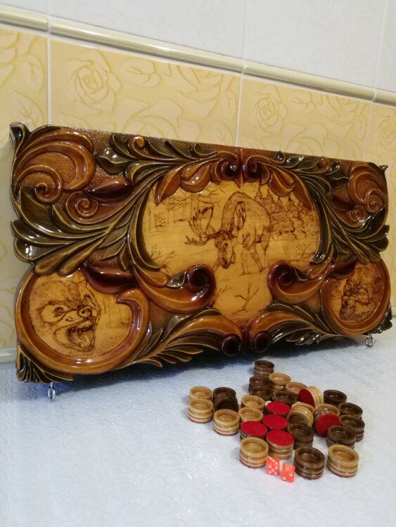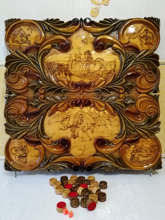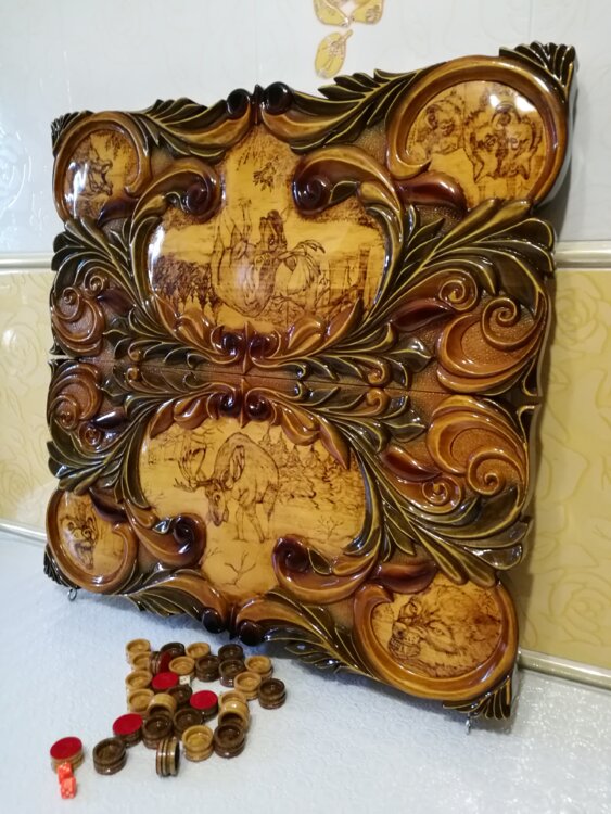 Нарды ручная резьба вырезанные со всех сторон и боков также и внутри нард на бортах есть резьба цветные био лаки нарды облагорожены чеканкой по дереву размер нард 60 на 60см фишки ясень дуб кубики кость. Поиграл и повесил на стенку украсит любой интерьер и создаст уютную обстановку а не будут пылиться в углу Широкий выбор в наличии выбираете. Пишите звоните телеграм ватцап ваибер и мы вам поможем выбрать эксклюзивные нарды ручной резьбы а не дешёвую поделку вырезанные на станке выдающую за ручную резьбу!
