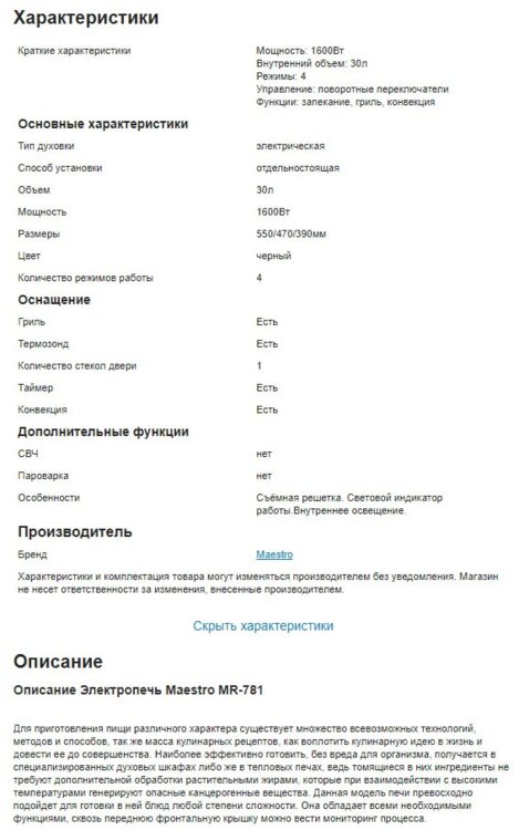 Характеристики Maestro MR 781