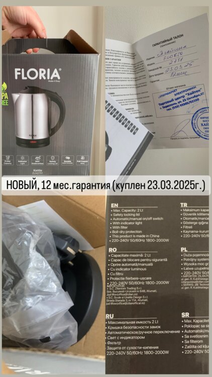 Продаётся НОВЫЙ Электрочайник Floria ZLN2751 2л н/ж, 12 мес. гарантия куплен 23.03.2025г. Крышка чайника внутри металлическая!