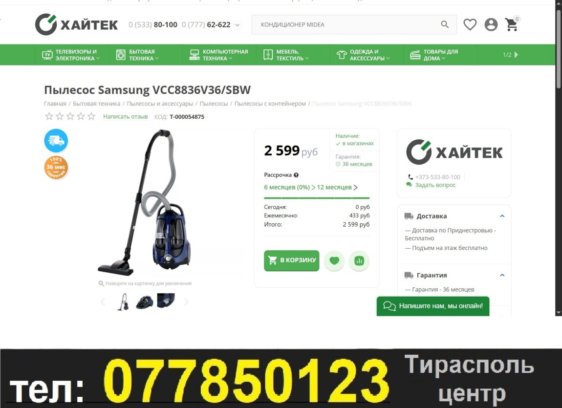 Пылесос Samsung SC8836 контейнерный с двумя отсеками и с двухсекционным циклонным фильтром тонкой очистки HEPA 13, можно мыть и контейнер и фильтра. Мощность всасывания 430Вт, 2200 Вт с регулировкой мощности. Шнур выдвигается на 7 метров. Реально, очень мощное всасывание. При покупке, включу для проверки. В Хай-Теке стоит 2500 руб - Отдам за 1800 руб. По вопросам пишите в Вайбер, Вацап или звоните 077850123, Тирасполь, центр