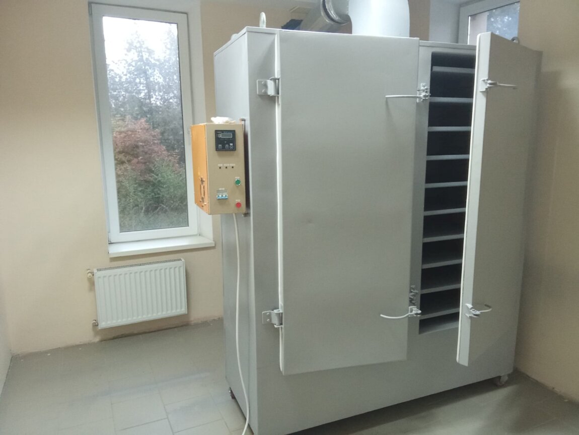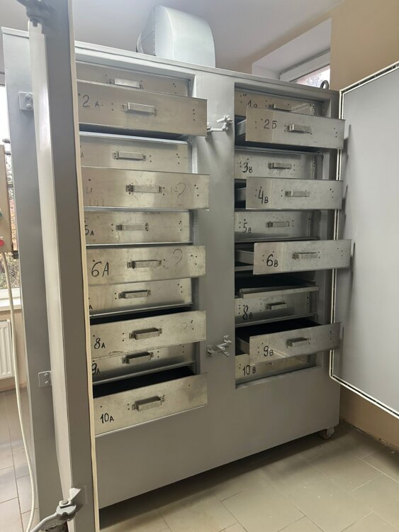 Сушильный шкаф б/у, двустворчатый, на 20 сетчатых лотков из нержавейки. Производство Харьков, Украина. Прошел полную профилактику. Все прокладки и уплотнители новые оригинальные с завода. Блок нагревательных элементов абсолютно новый, заводской. Восстановлены все лакокрасочные покрытия, сертифицированные по пищевому стандарту(немецкие спец. красители). Все сушильные лотки для непрерывности процесса разделены металлическими мембранами на секции: при выдвижения одного лотка для контроля, не останавливает процесс сушки в остальных секциях. Процесс сушки управляется компьютером по установленной по желанию программе, как по температуре, так и по длительности процесса. Блок вентилятора и нагревательных элементов расположен сзади шкафа. Нагнетаемый вентилятором воздух подаётся на нагревательные элементы и затем, через входной люк с тыльной стороны снизу, удаляется вместе с влагой через верхний вытяжной вентилятор. Конструкцией шкафа предусмотрены подача горячего воздуха и вытяжка на каждую рабочую секцию высушиваемого продукта отдельно. Возможно подключение как на 380, так и на 220. При стартовом разогреве шкафа мощность 7квт. Затем сушка в рабочем режиме 3,5 квт. Продавец обеспечивает доставку шкафа покупателю, а также установку наладку и запуск в производство. Цена договорная. Рассматриваются варианты оплаты, рассрочка.