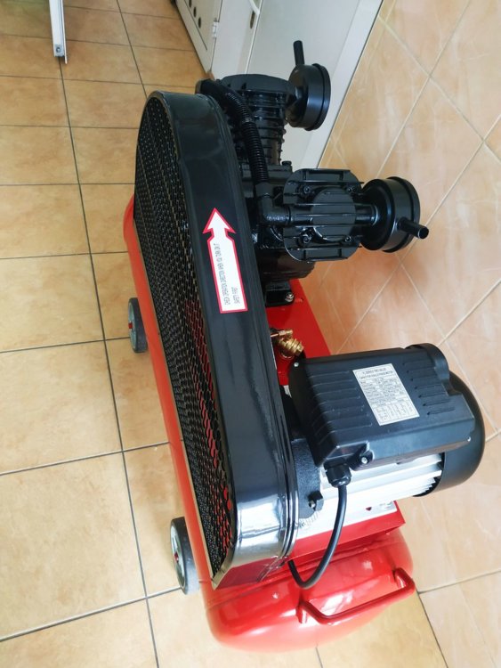 Компрессор имеет V-образную головку цилиндров, у верхнего основания которых располагаются два всасывающих металлических фильтра. Компрессор оснащен однофазным электродвигателем 230В (3600 Вт), Ресивер (100 л)