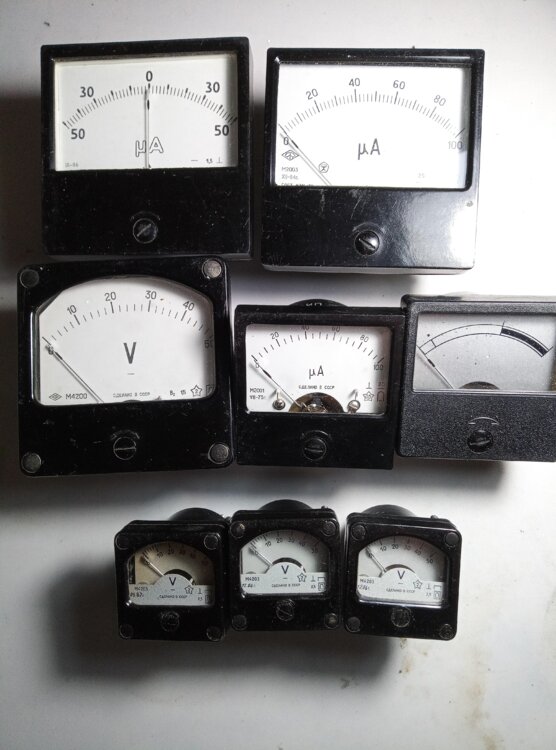 13) Микроамперметры, вольтметры. Большие 50 рублей за штуку маленькие и средние 30 рублей.