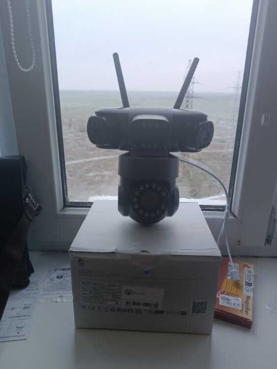 WiFi камера безопасности с 4 объективами, 360° полное покрытие, 16x оптический зум, цветное ночное видение, автоматическое отслеживание, двусторонняя аудиосвязь и PTZ управление, удаленный доступ и поддержка TF, круглосуточный мониторинг для дома и офиса, использование на улице, совместимость со смартфоном. есть проводное подключения тоже. Верхние две камеры выставляются в любое положения куда надо вручную. средняя всегда смотрит в одно положения а нижняя управляется с смартфона, планшета и тд