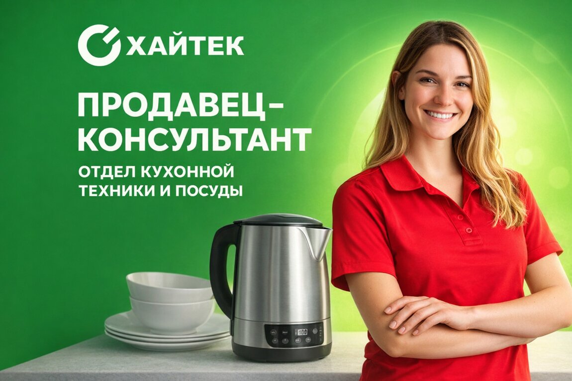 Магазин "Хайтек" приглашает на постоянную работу продавца-консультанта в отдел кухонной техники и посуды.