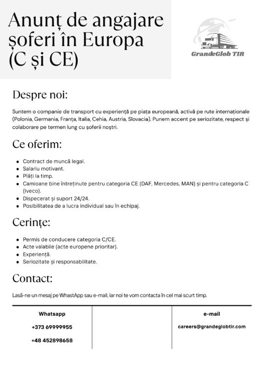 Suntem o companie de transport cu experiență pe piața europeană, activă pe rute internaționale (Polonia, Germania, Franța, Italia, Cehia, Austria, Slovacia). Punem accent pe seriozitate, respect și colaborare pe termen lung cu șoferii noștri.