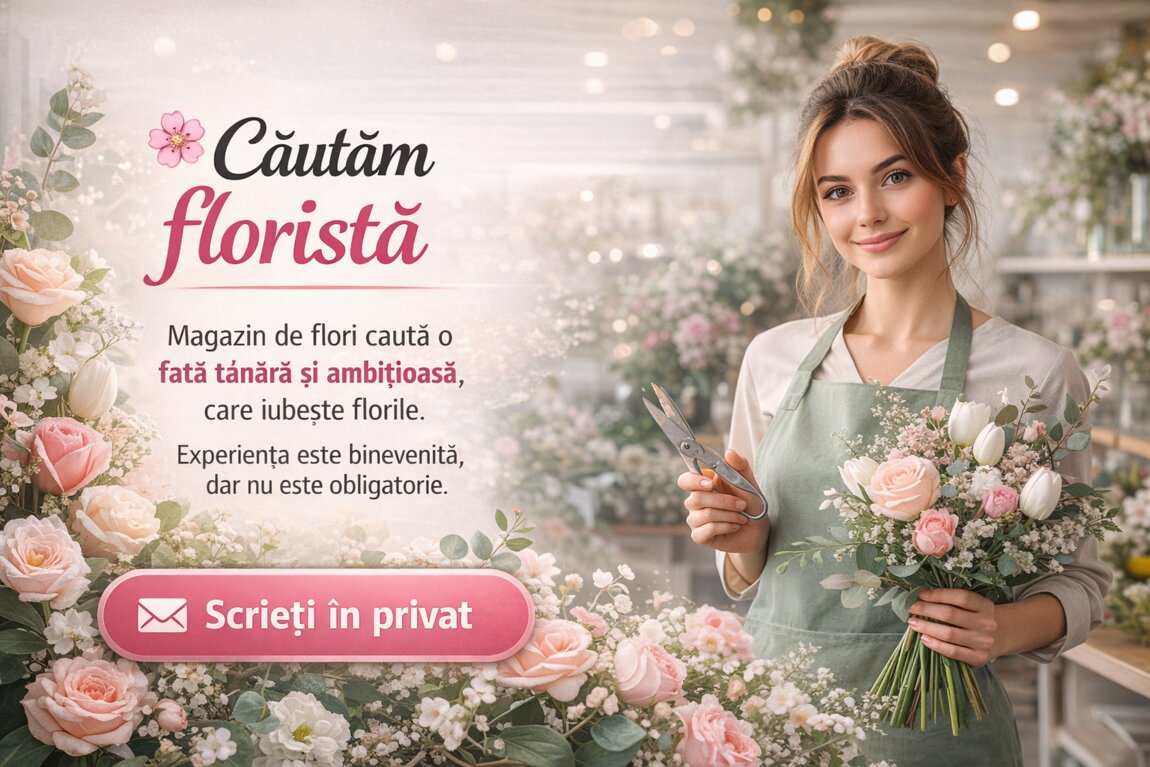 В наш цветочный магазин требуется молодая, целеустремлённая девушка-флорист, которая любит цветы и творческую работу.