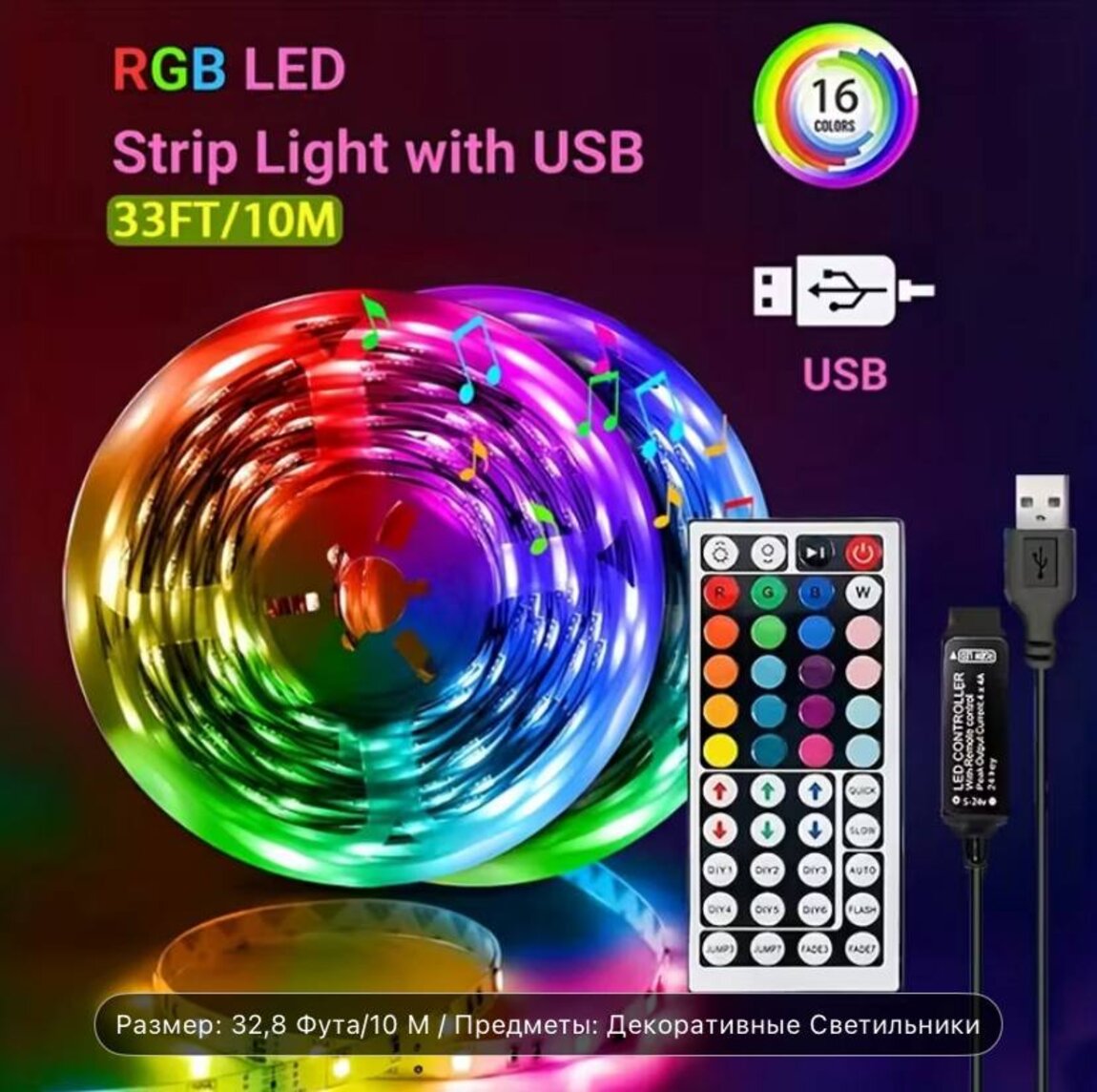 RGB-лента 10 метров — с пультом! USB-питание