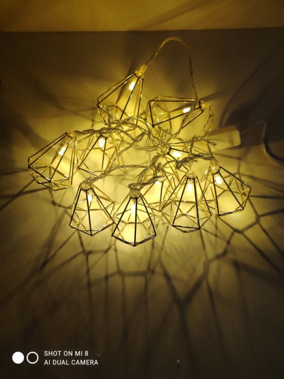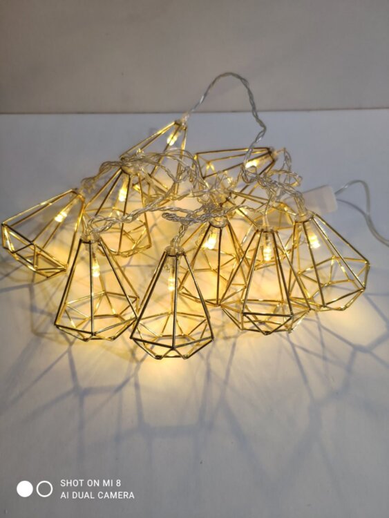 Это декоративная светодиодная гирлянда длиной 3 м с 10 металлическими фигурками золотистого цвета размером примерно 6×5,5 см, с мягким тёплым светом. Фигурки из металла придают гирлянде стильный, «кристальный» праздничный вид — при освещении свет красиво рассеивается, создавая атмосферу уюта и торжества.