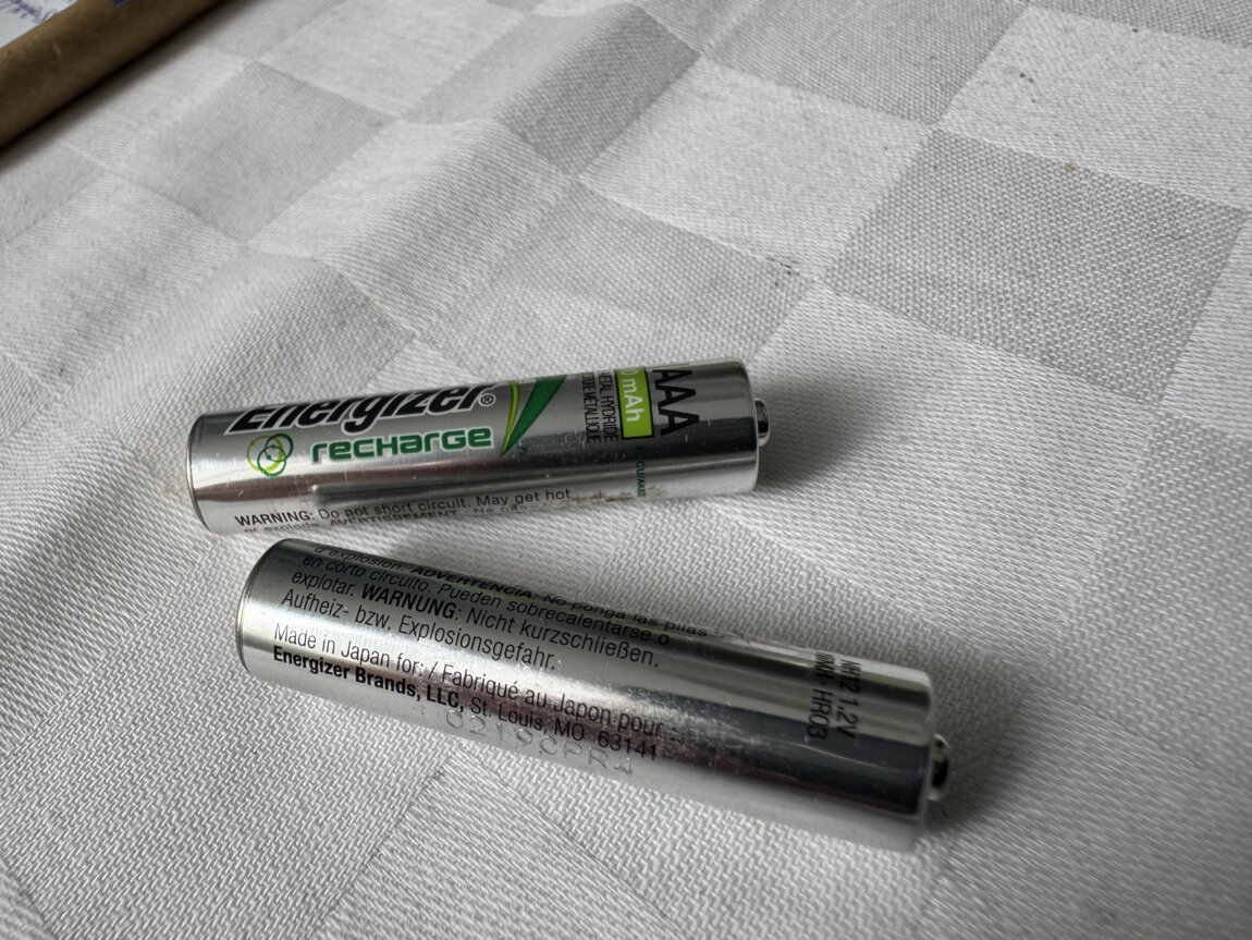 Аккумуляторные батарейки ААА, 4 штуки. Две из них новые неиспользованные. Батарейки оригинальные Energizer, сделанные в Японии. Аккумуляторные батарейки в комплекте не шли. За них пришлось заплатить, но сейчас они входят в общую цену.