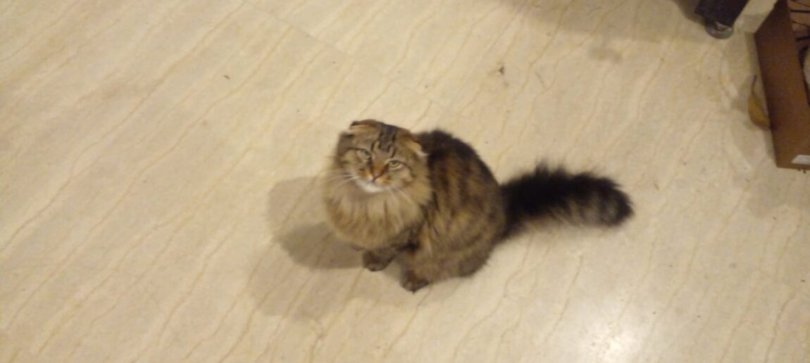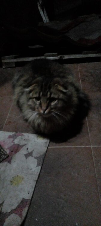 Добрая ласковая и весьма красивая, напоминает хайлендер или американского керла.