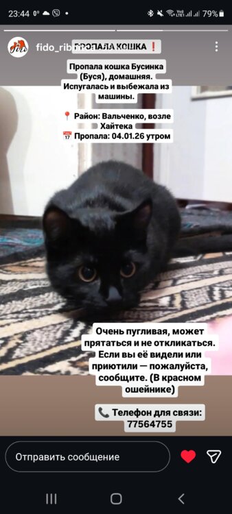 Пропала кошечка Бусинка(Буся), домашняя, испугалась и выбежала из машины. г. Рыбница, р-он Вальченко возле Хайтека. Пропала 04.01.26г. утром. Очень пугливая, может прятаться и не откликнуться. Она в красном ошейнике. Помогите ПОЖАЛУЙСТА найти!