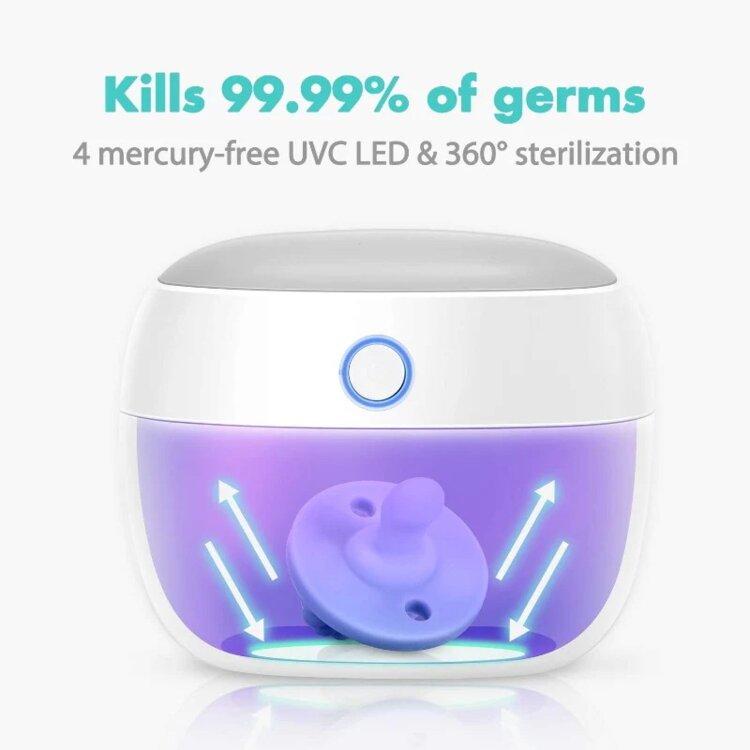 Портативный УФ-стерилизатор Papablic в состоянии нового (использовался несколько раз, т. к. пустышками не пользовались), оснащенный 4 безозоновыми и безртутными УФ-светодиодами, обеспечивает 99,99% стерилизацию ваших пустышек всего за 59 секунд! УФ-стерилизатор оснащен встроенным аккумулятором USB, которого при полной зарядке хватает на 2–3 недели. Кроме того, он оснащен удобным ремнем для вашей коляски или сумки для подгузников во время путешествия. Работает от аккумулятора. Имеет 2 режима стерилизации: 59 сек и 3 мин