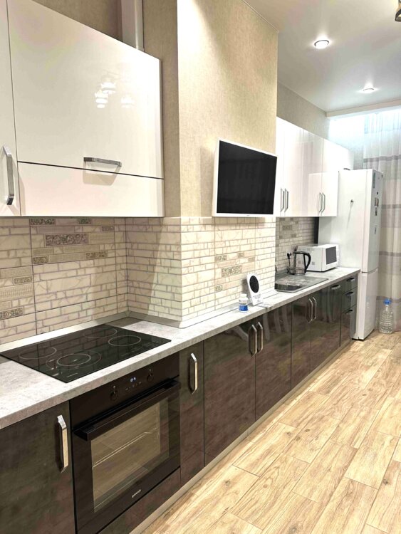 12 этаж, 46 м2, отдельная спальня с кроватью, кухня-гостиная с диваном. Вся бытовая техника, духовка, 2 ТВ, кондиционер.