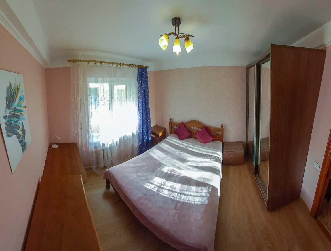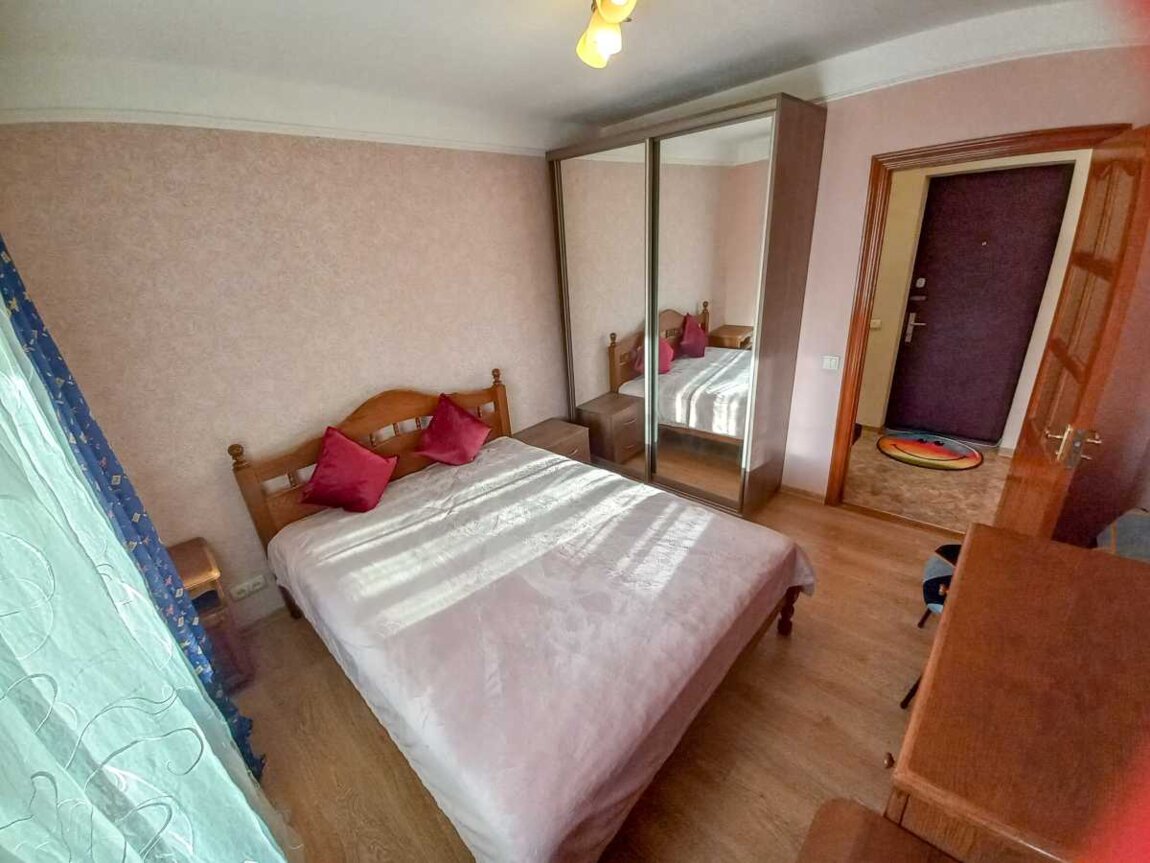 Двоспальне ліжко, диван, крісла, дві шафи купе, велика лоджія засклена та обшита.
